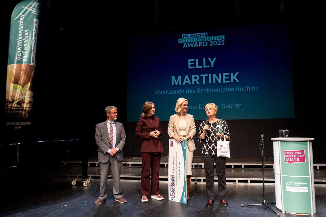 v.l.n.r.: Thomas Früh (Landesseniorenbeauftragter Sachsen), Elisabeth Kaiser (Beauftragte der Bundesregierung für Ostdeutschland), Manuela Thomas (Initiatorin der Sächsischen Generationenagentur), Elly Martinek (Preisträgerin, Rochlitz)